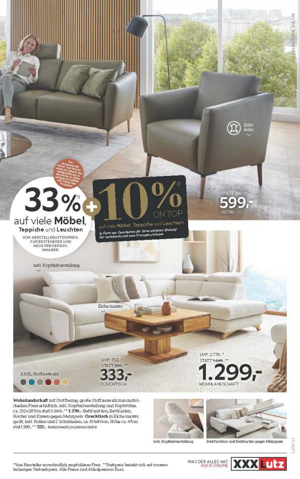 Sie sind an der richtigen Stelle, um den neusten Katalog von XXXLutz zu lesen ! Sehen Sie unten die letzten Kataloge von XXXLutz gültig ab 08 Oktober bis 21 Oktober. Sie sehen Rezensionen an, teilen Sie Ihre Meinung und Sie können über Katalogprodukte lesen. Sie können auch alle verfügbaren Kataloge aus derselben Kategorie ansehen, um gleichen Produkte in anderen Läden zu vergleichen. Verpassen Sie nicht Schnäppchen und Bereiten Sie Ihre Online-Shopping und Sparen Sie das ganze Jahr. Auf dieser Seite, XXXLutz Angeboten, Prospekte, Promotion und Sonderangebote.
