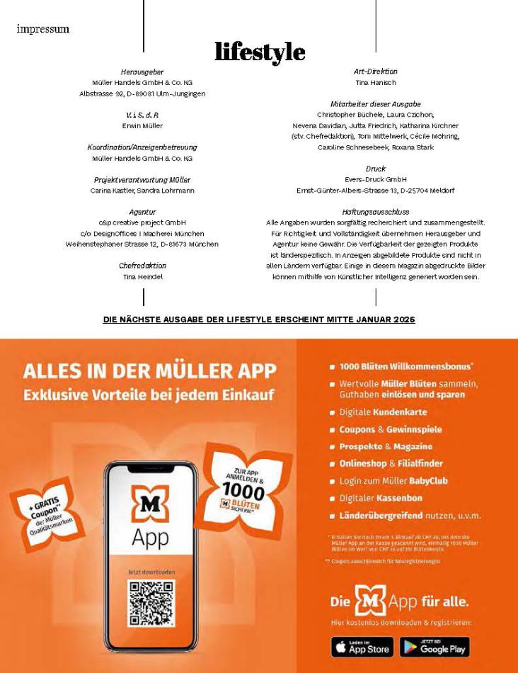 Sie sind an der richtigen Stelle, um den neusten Katalog von Müller zu lesen ! Sehen Sie unten die letzten Kataloge von Müller gültig ab 20 November bis 31 Dezember. Sie sehen Rezensionen an, teilen Sie Ihre Meinung und Sie können über Katalogprodukte lesen. Sie können auch alle verfügbaren Kataloge aus derselben Kategorie ansehen, um gleichen Produkte in anderen Läden zu vergleichen. Verpassen Sie nicht Schnäppchen und Bereiten Sie Ihre Online-Shopping und Sparen Sie das ganze Jahr. Auf dieser Seite, Müller Angeboten, Prospekte, Promotion und Sonderangebote.